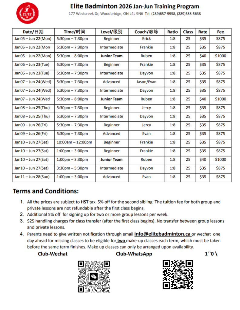 4. Parents need to give written notification through email info@elitebadminton.ca or wechat  one day ahead for missing classes to be eligible for two make-up classes each term, which must be taken before the same term finishes. Make up classes can only be arranged upon availability.